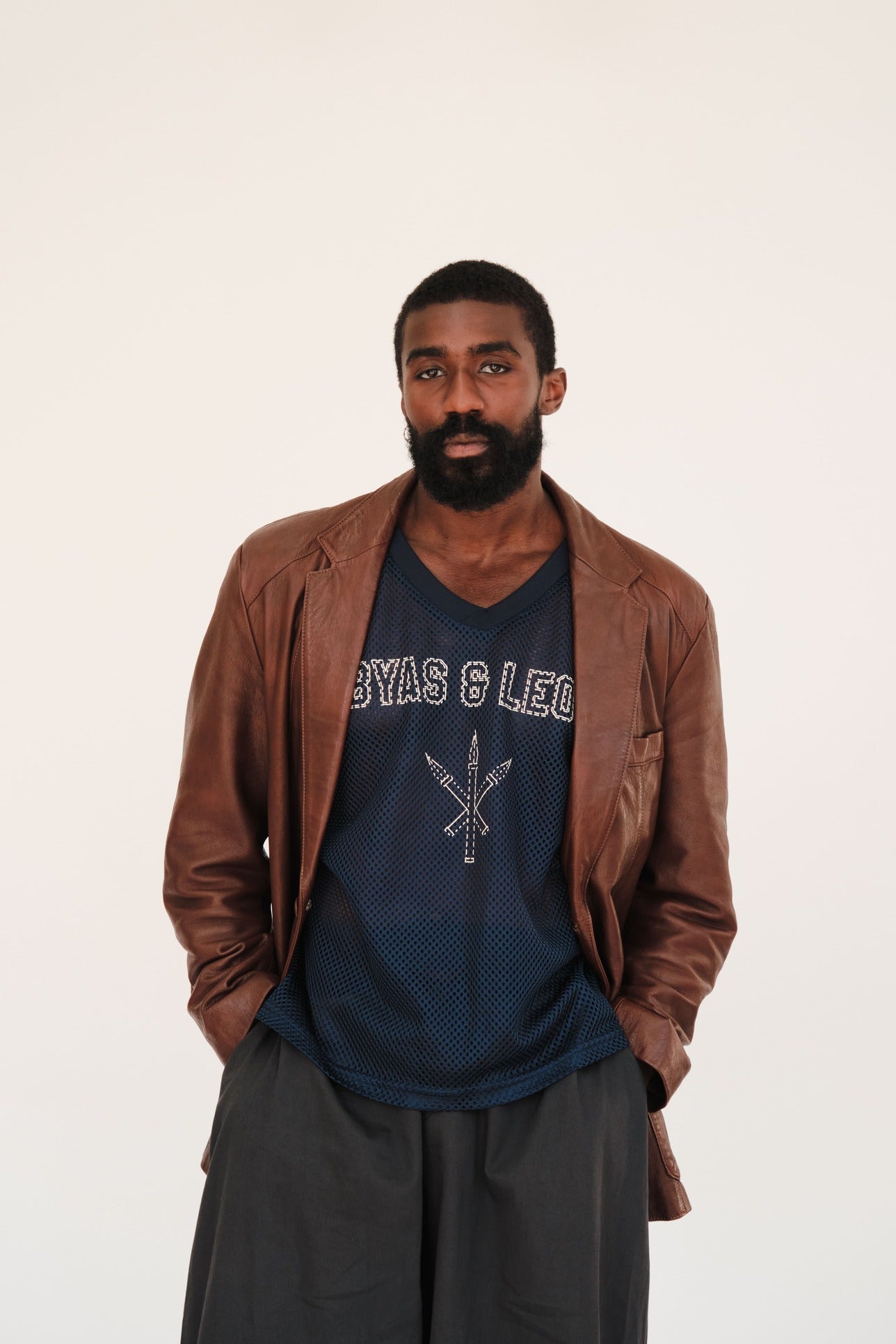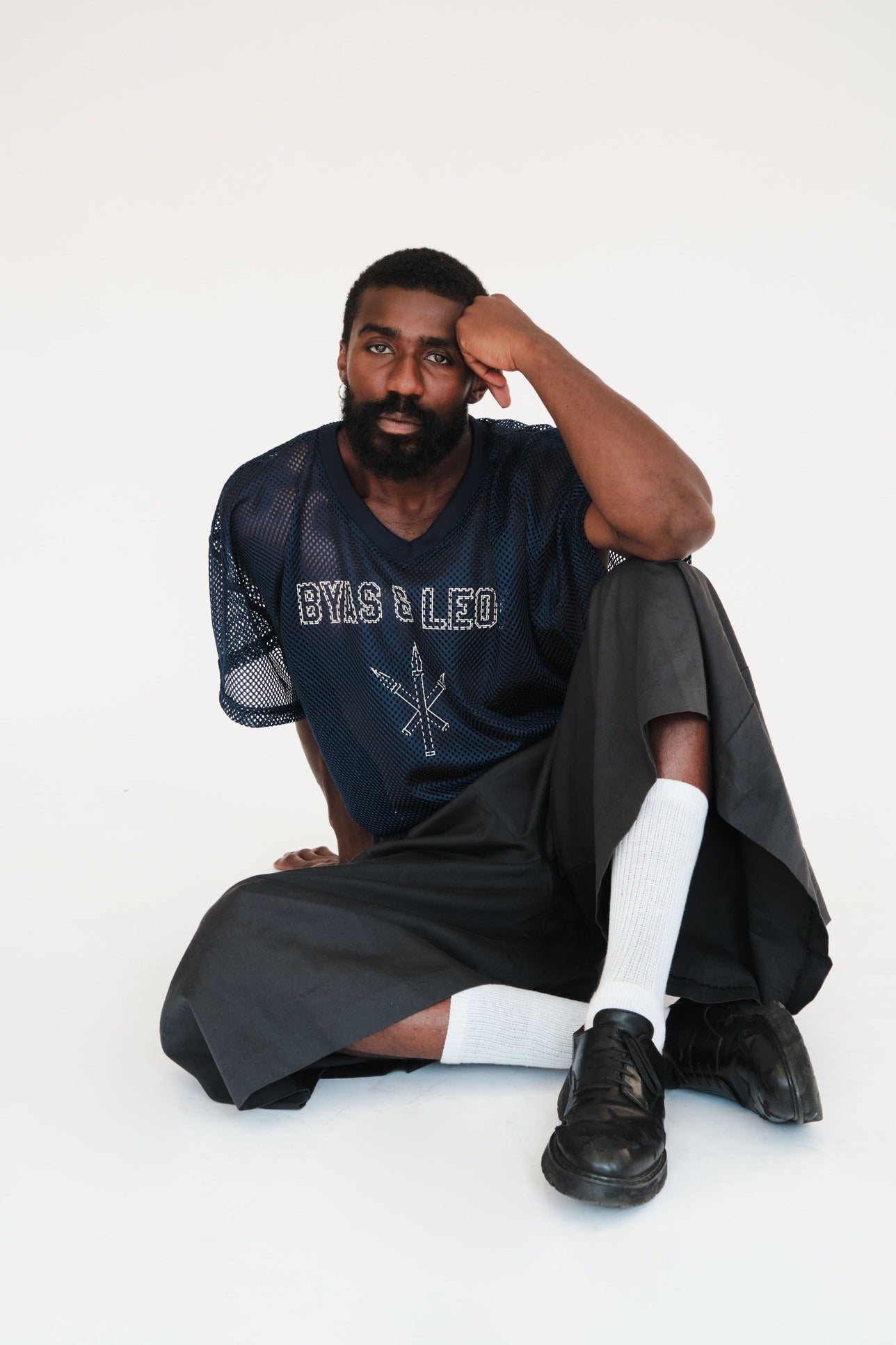 The garments are mesh football practice jerseys—printed with the Byas & Leon logo + the 'tri-spear' symbol of our monogram on the front, with the number '19' printed on the backs of both in an off-white/cream color.